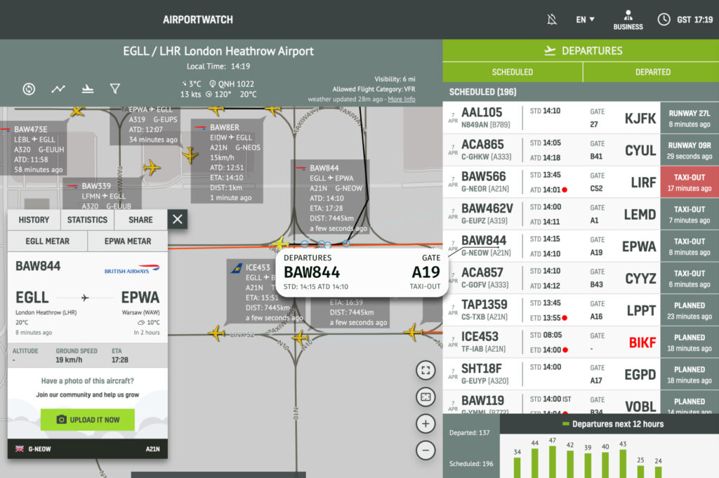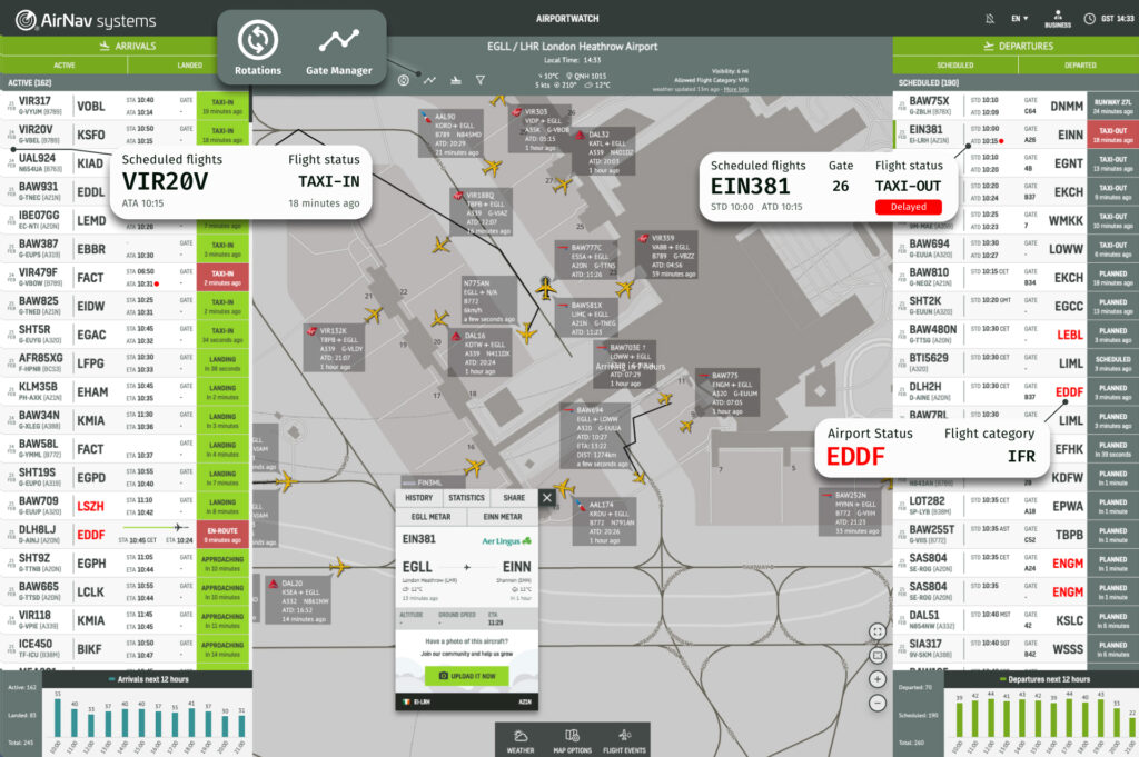 Designed for ATC, FBOs, and charter operators, AirportWatch provides a unified view of inbound and outbound air traffic with intuitive maps and dynamic flight boards. It features interactive airport maps with labeled gates, a timeline-based gate manager, and critical insights into aircraft rotations, on-time performance, and real time weather.