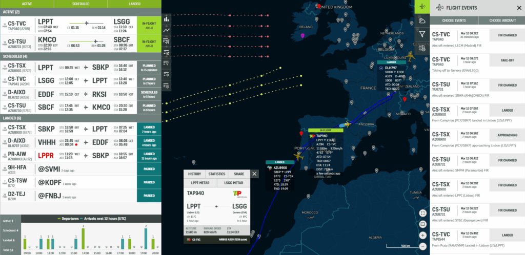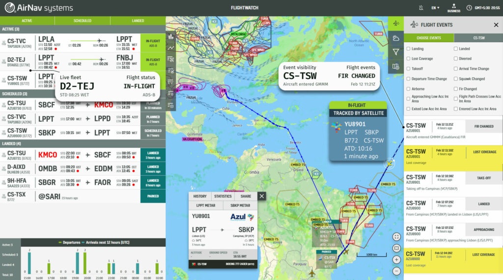View real-time global fleet activity, which include the positions of your entire fleet, along with a list of active, landed, and scheduled flights.