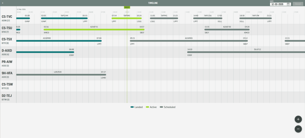 The fleet manager allows users to easily add or remove aircraft from their fleet, monitor fleet activity through an interactive timeline, and analyze operations using built-in statistics, filtering, and sorting tools.